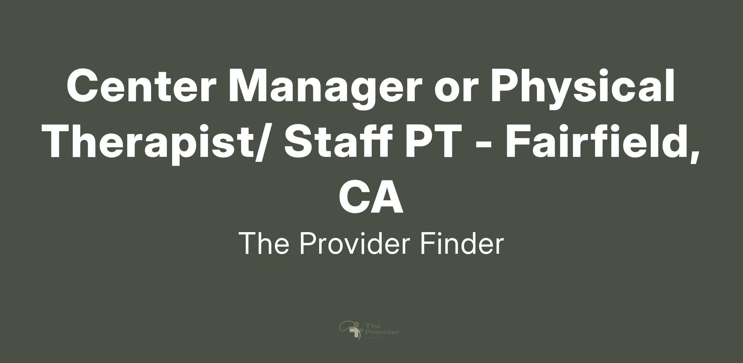 Top healthcare facility in California is looking to hire a Center Manager or Physical Therapist in the Fairfield area.