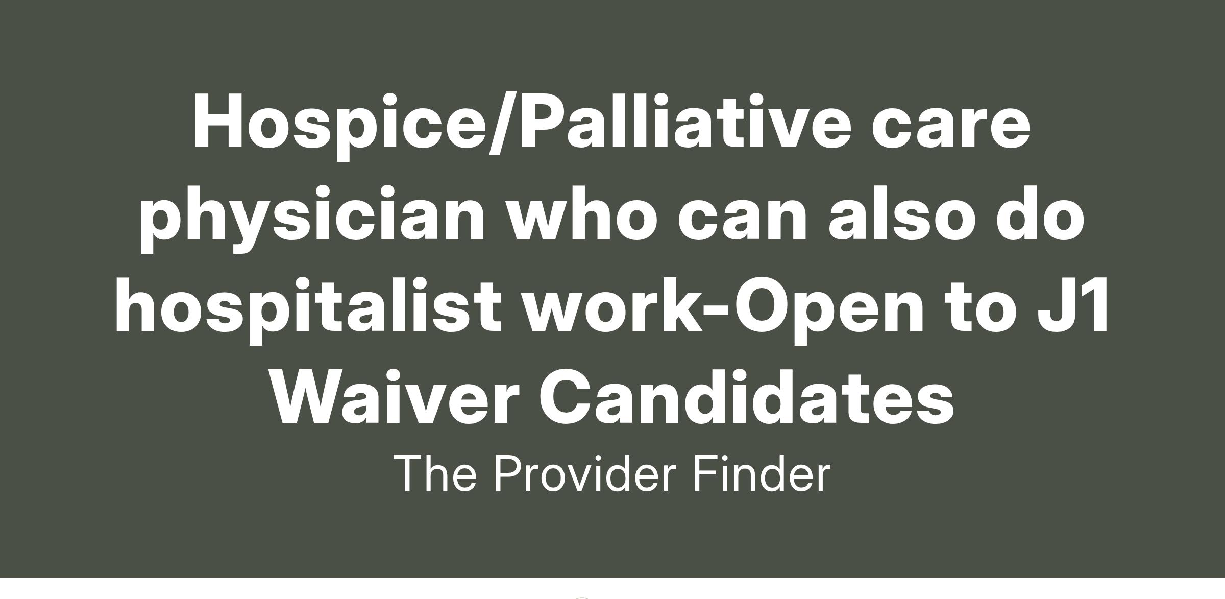 We are seeking a compassionate and highly skilled Hospice/Palliative Care Physician with the flexibility to also provide hospitalist services. This position offers a unique and fulfilling opportunity to deliver high-quality, patient-centered inpatient and outpatient care, focusing on palliative, hospice, and acute hospital care. We welcome J1 waiver candidates who meet the criteria and have a passion for providing empathetic, end-of-life care.