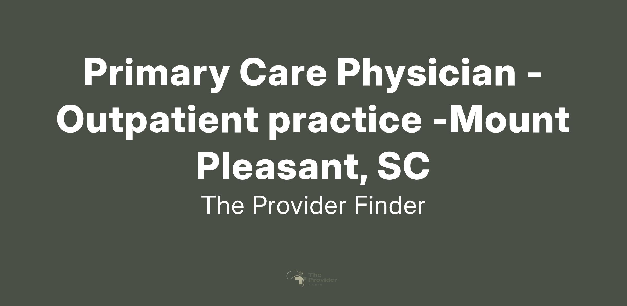 Top medical group in South Carolina is looking to hire a Primary Care Physician for their outpatient practice in the Mount Pleasant, SC area.